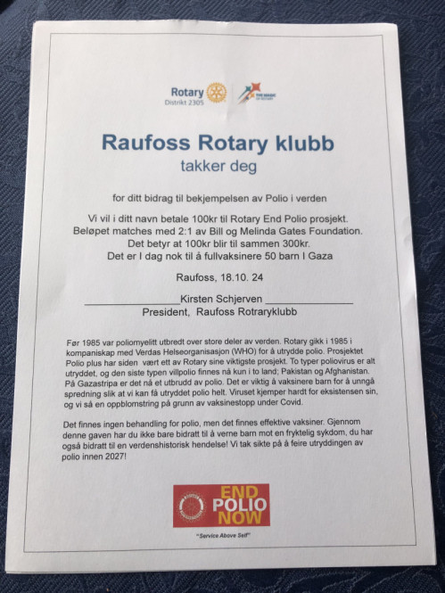 Du vil møte Raufoss Rotarykubb på Amfi, Raufoss fredag 18.10. Der skal vi selge diplomer, som vil gi inntekter til fullvaksinering av barn i Gaza. Diplomet vil koste 100kr. Vaksinasjon av et barn koster 6kr. Vi håper at besøkende på vår stand vil bidra med hjelp til mange barn, som kan være utsatt for poliomyelitt smitte, hvis de ikke får vaksine.