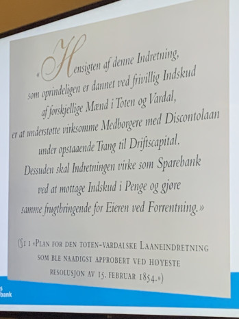 Eskild har vært i Bankvesenet siden 1977, og bodd i Vestre Toten siden 1991. Totens Sparebank er 170 år i år. Eskild fortalte om opp- og nedturer i et historisk perspektiv fra Hans Sverre Sommerfeldts tid som første leder i 1854.