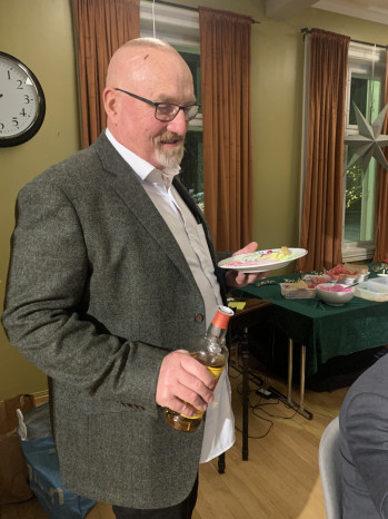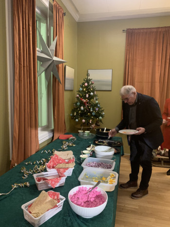På menyen sto rakfisk med godt tilbehør og godt drikke, kaffe og julekaker. Praten gikk livlig, og vi sang julesanger. Åshild leste en god historie med rett dialekt fra "sin" landsdel.