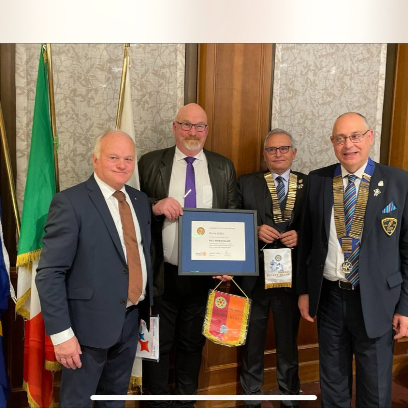 Godt forberedt, og med diplomet behørig plassert i glass og ramme, overrakte Charles og Sigmund beviset. PHF og diplomet Paul Harris Fellow (PHF) til Maria Bellito. Maria var dessverre forhindret for å delta, og vil derfor få det  overrakt både medaljen og diplomet på et senere møte i Roma Rotary klubb.