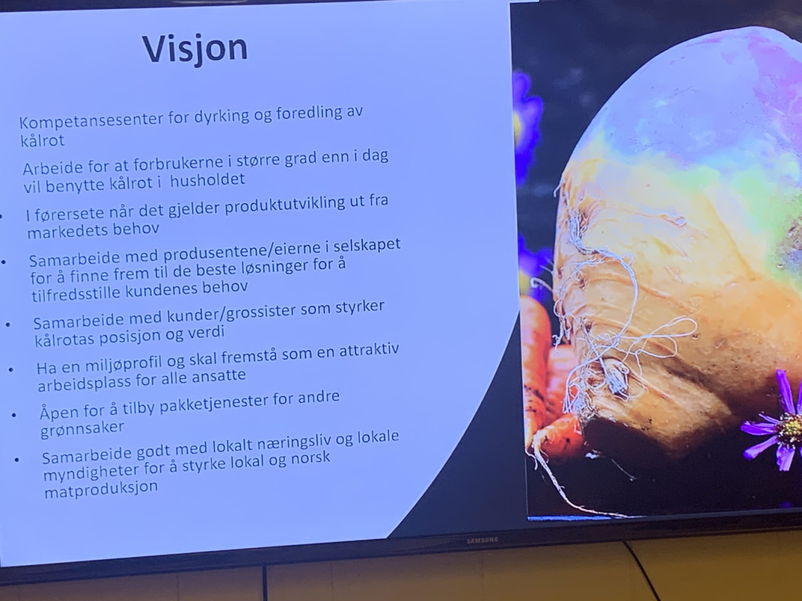 · Torgeir snakket varmt om håpet om å snu trenden, dvs å få de unge til å spise mer kålrot. Kålrota er krevende å produsere, men en vinner på kjøkkenet; den er klimavennlig, kan brukes allsidig, og er et økonomisk produkt.