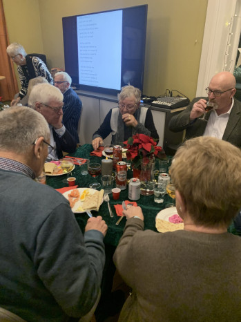 På menyen sto rakfisk med godt tilbehør og godt drikke, kaffe og dessertkake. Praten gikk livlig, og vi sang julesanger, akkompagnert på piano av Anne Kari Sivesind. Arild leste juleevangeliet på sin gode dialekt. En fin opplevelse før høytiden.
